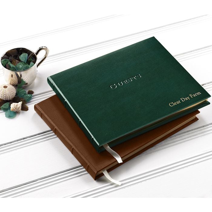 Our Leather Guest Books can be found at a wedding in Napa Valley, or at a fishing camp in Maine, and at many addresses and occasions in between. When guests visit or congregate our “open format” page design lets them express their thoughts and thanks without restraint. Personalized Leather Guest Books are available.